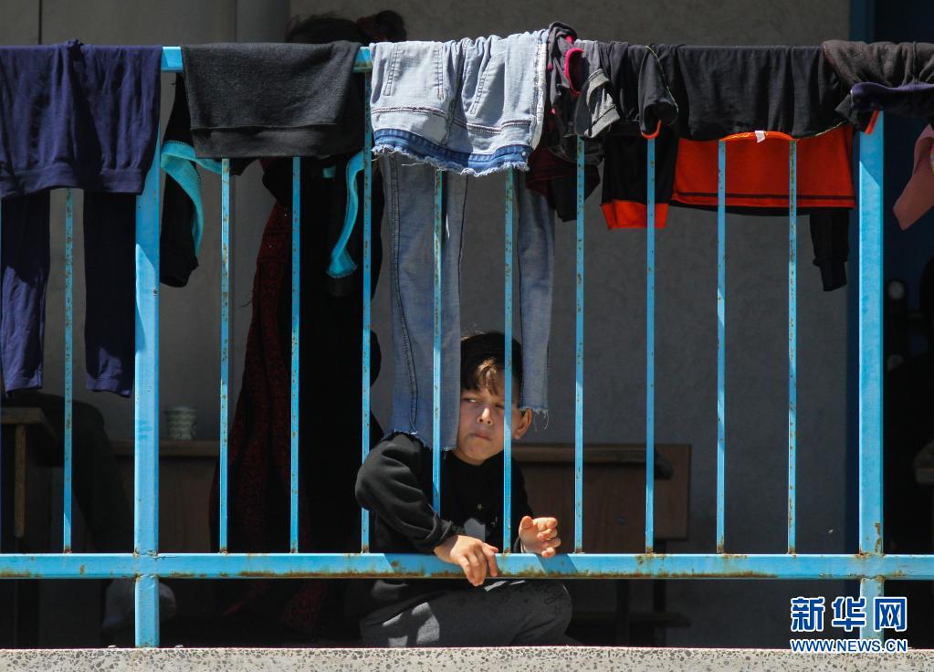 5月19日,受空襲影響而逃離家園的5歲巴勒斯坦兒童艾哈邁德·蘇丹在加沙城的一所學(xué)校臨時棲身。