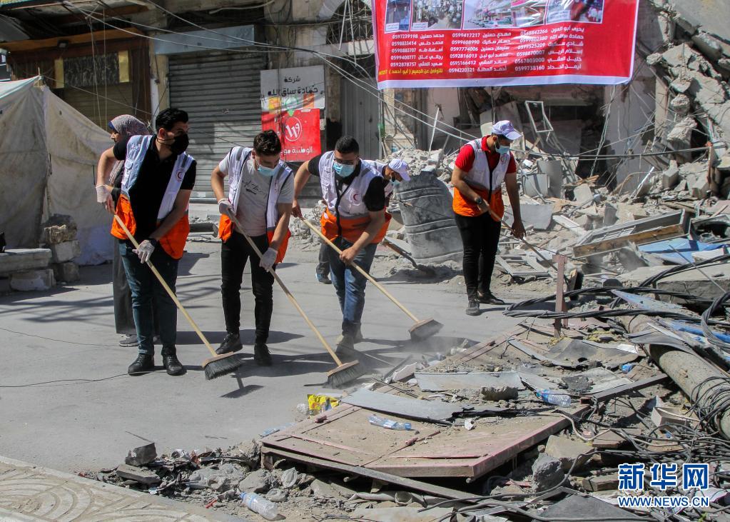 5月23日,巴勒斯坦志愿者在加沙城一處遭到以色列轟炸的地點(diǎn)清理廢墟。