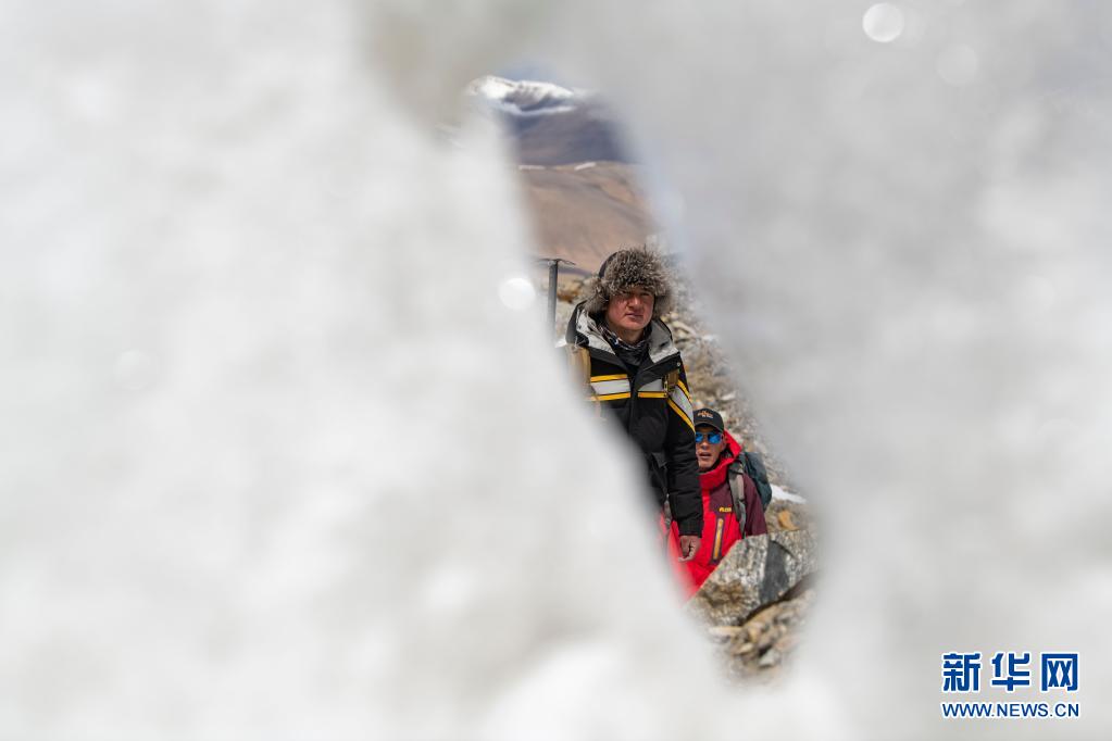 別克米爾扎·圖爾達力(前)和同伴庫爾班巴依·努爾麥麥提在適應性練習中從冰川旁經(jīng)過(5月16日攝)。新華社記者 胡虎虎 攝