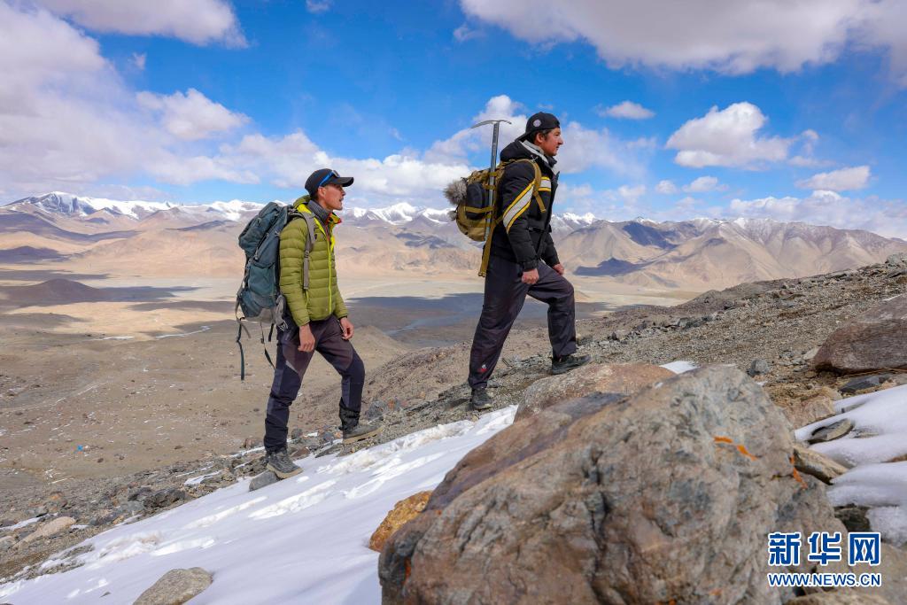 別克米爾扎·圖爾達力(前)和同伴庫爾班巴依·努爾麥麥提行走在山間,準備進行適應性練習(5月15日攝)。每年登山季到來前,他們會選擇天氣晴好時進行訓練,適應環(huán)境。新華社記者 胡虎虎 攝