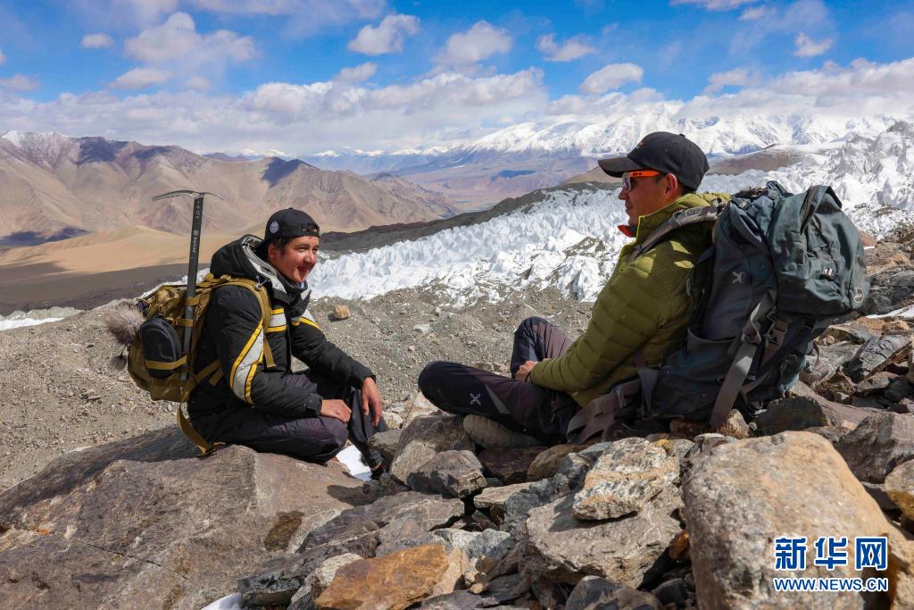 在慕士塔格峰海拔約4800米處,別克米爾扎·圖爾達(dá)力(左)和同伴庫爾班巴依·努爾麥麥提休息聊天(5月15日攝)。新華社記者 胡虎虎 攝