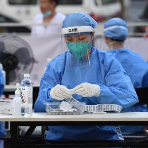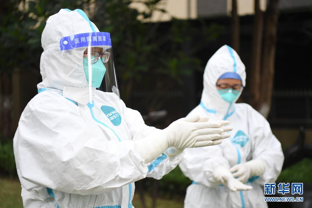 5月27日,在廣州荔灣區(qū)白鶴洞街道一小區(qū)檢測點(diǎn),荔灣區(qū)骨傷科醫(yī)院的醫(yī)護(hù)人員在開始檢測前檢查防護(hù)裝備。新華社記者 鄧華 攝