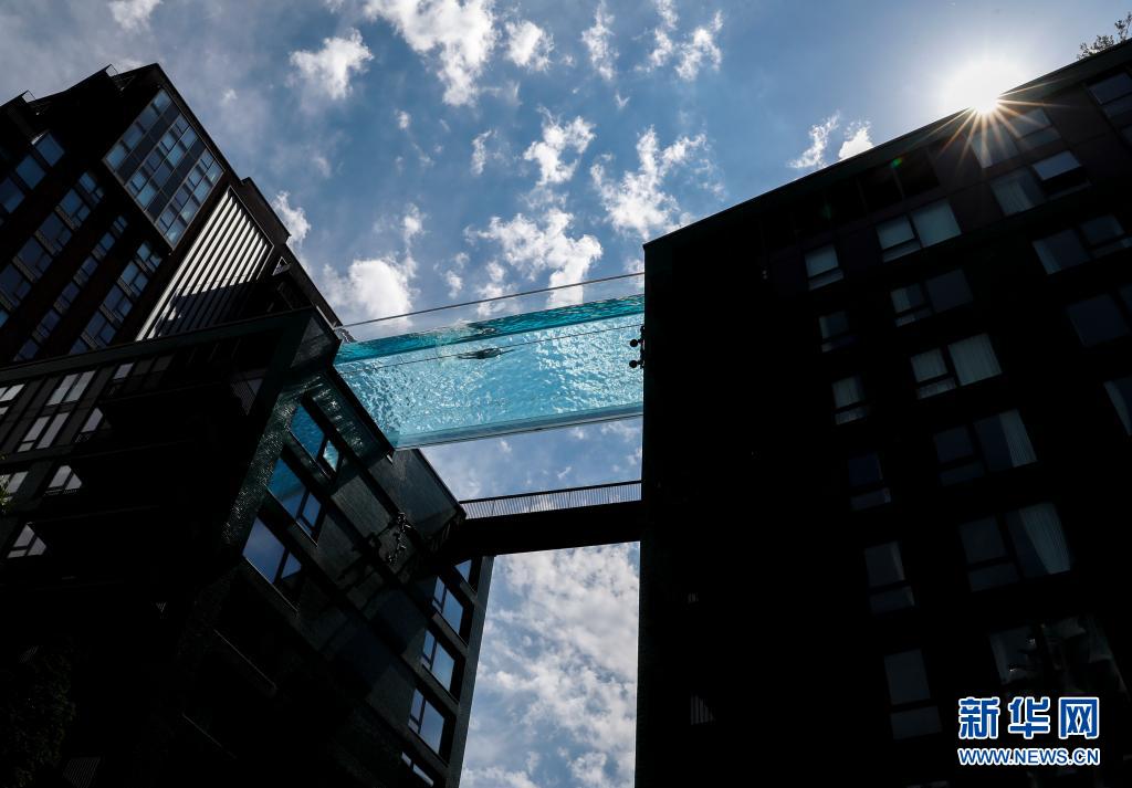 6月2日,一名男子在英國倫敦南部一個(gè)建造于兩棟公寓樓之間的“空中泳池”游泳。