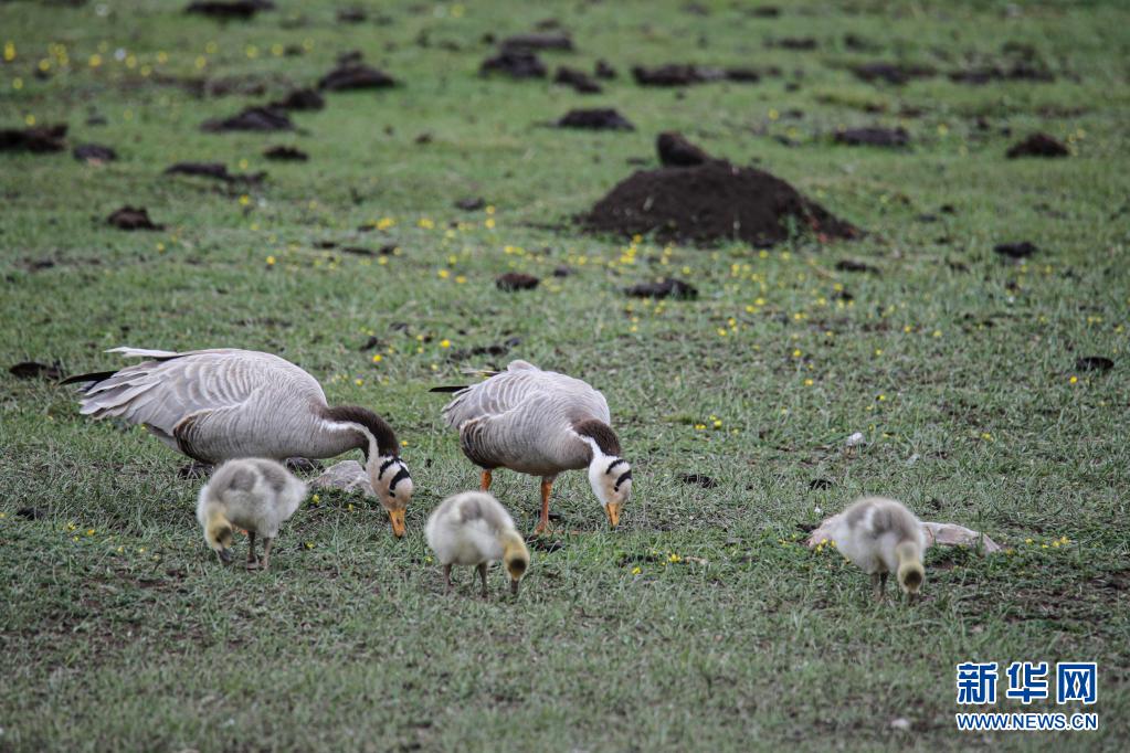 這是6月2日在甘肅省甘南藏族自治州碌曲縣尕海湖拍攝的斑頭雁及其幼鳥(niǎo)。