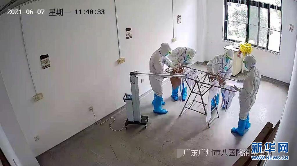 6月7日,廣州市八醫(yī)院嘉禾院區(qū)監(jiān)控畫面顯示,醫(yī)護人員對隔離病房考生的試卷、答題卡進行二次消毒。新華社發(fā)