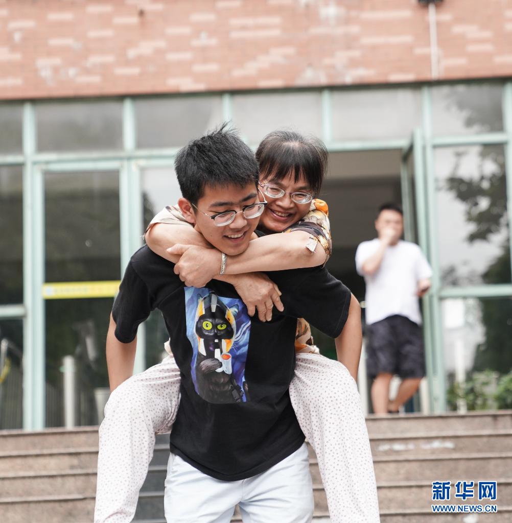 6月1日,趙建軍背著母親下臺(tái)階。新華社記者胡晨歡攝