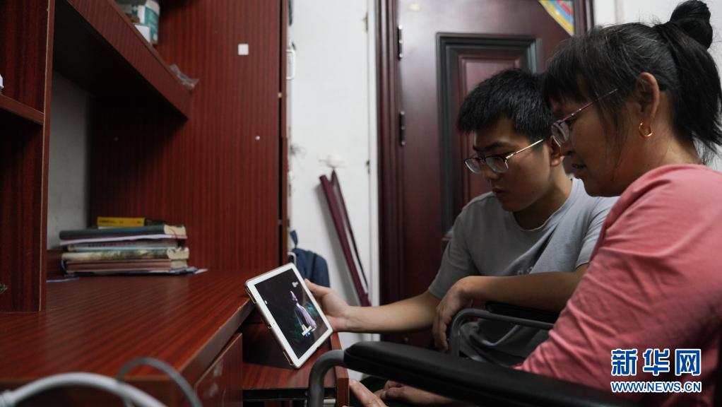 6月2日,趙建軍和母親在宿舍內(nèi)用平板電腦觀看電視劇。新華社記者胡晨歡攝