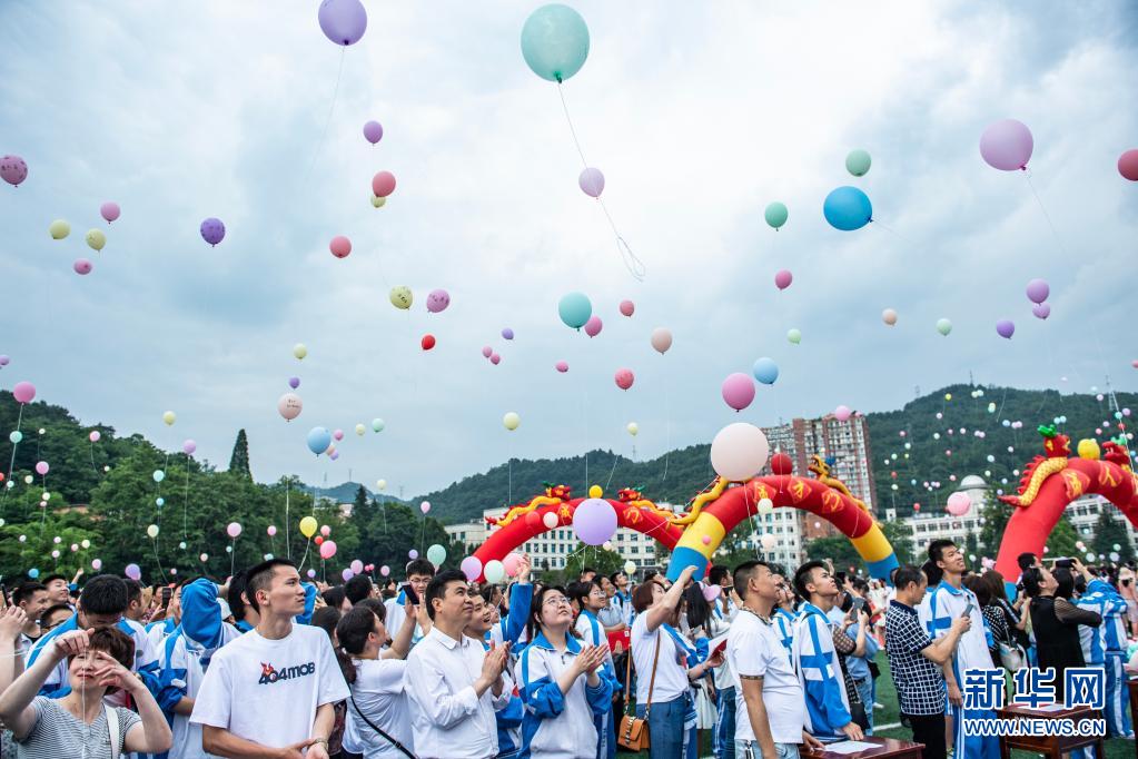 6月9日,烏當中學高三學生放飛氣球。