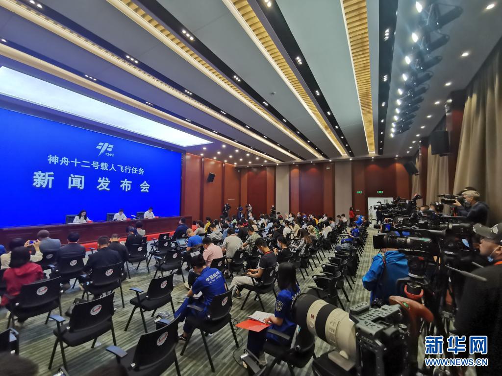 6月16日,神舟十二號載人飛行任務(wù)新聞發(fā)布會在酒泉衛(wèi)星發(fā)射中心召開(手機拍攝)。