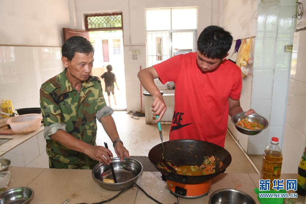 在廣西上思縣那琴鄉(xiāng)中心小學(xué)逢通村教學(xué)點,梁志雄老師在教一名學(xué)生盛菜(6月16日攝)。新華社記者 陸波岸 攝