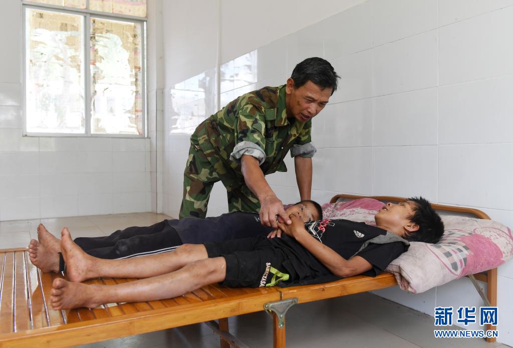 在廣西上思縣那琴鄉(xiāng)中心小學(xué)逢通村教學(xué)點(diǎn),梁志雄老師在照顧兩名學(xué)生睡午覺(6月16日攝)。新華社記者 陸波岸 攝