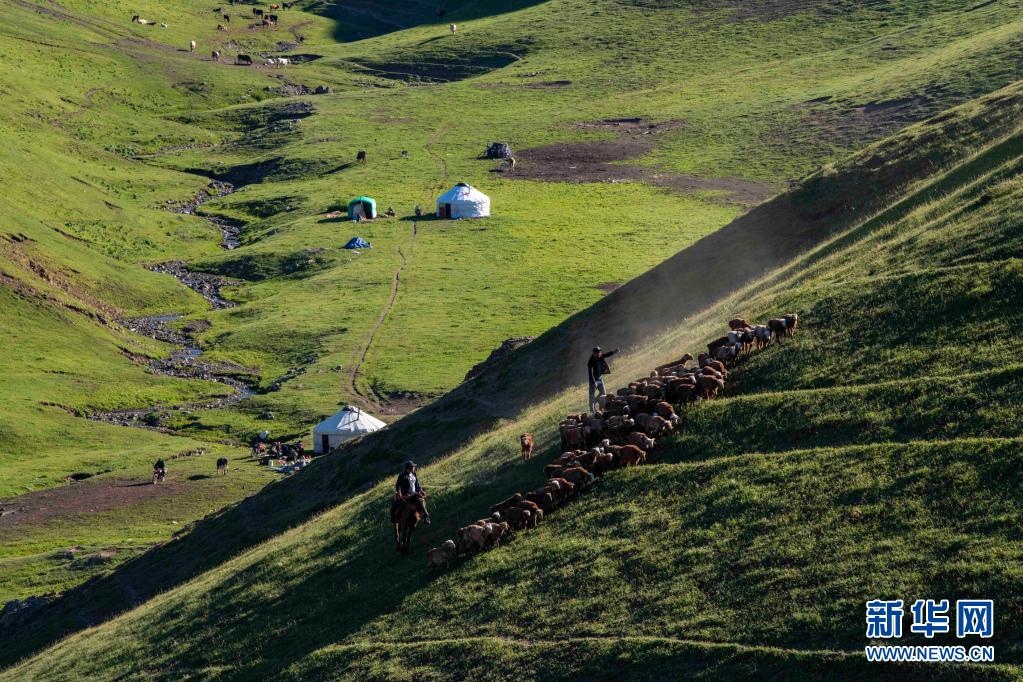眼下,巴爾魯克山區(qū)的夏牧場迎來放牧黃金季。群山起伏,峰巒翠綠,氈房、牛羊等牲畜分散點(diǎn)綴其間,自駕游客時(shí)而穿梭往來,共同譜寫一曲高山夏季牧歌。