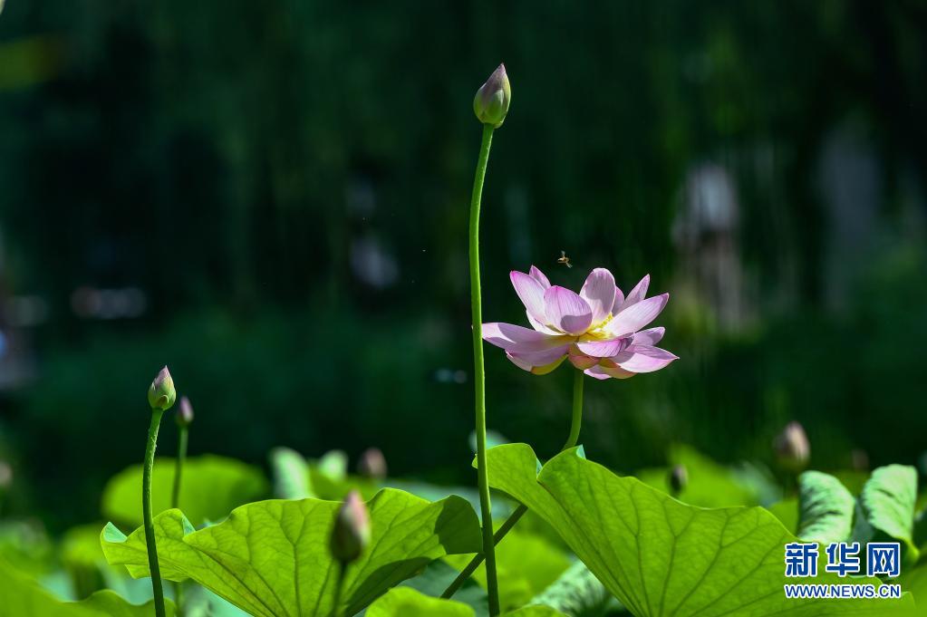 6月21日,蜜蜂飛舞在山東省青州市南陽河景區(qū)的荷塘里。