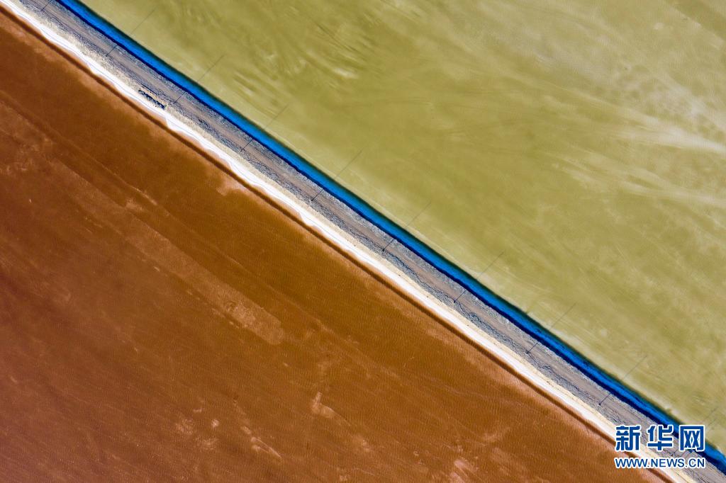 這是在新疆和布克賽爾蒙古自治縣瑪納斯鹽湖中鹽宏達鹽業(yè)生產基地拍攝的一處灘曬池(6月21日攝,無人機照片)。
