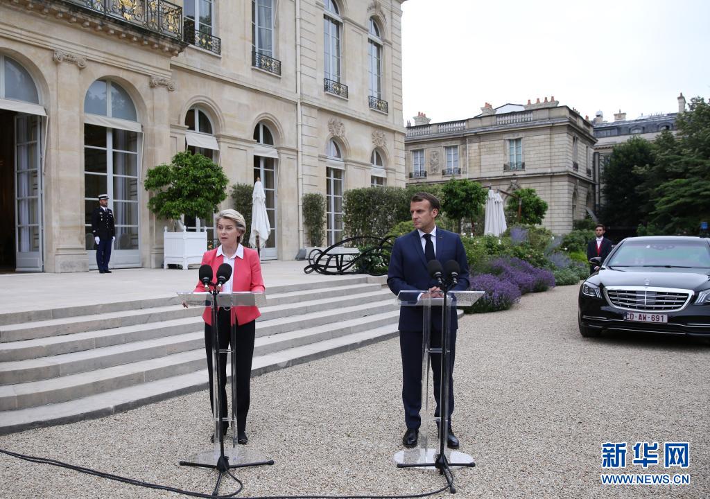 6月23日,法國(guó)總統(tǒng)馬克龍(右)與歐盟委員會(huì)主席馮德萊恩在巴黎總統(tǒng)府愛(ài)麗舍宮出席新聞發(fā)布會(huì)。