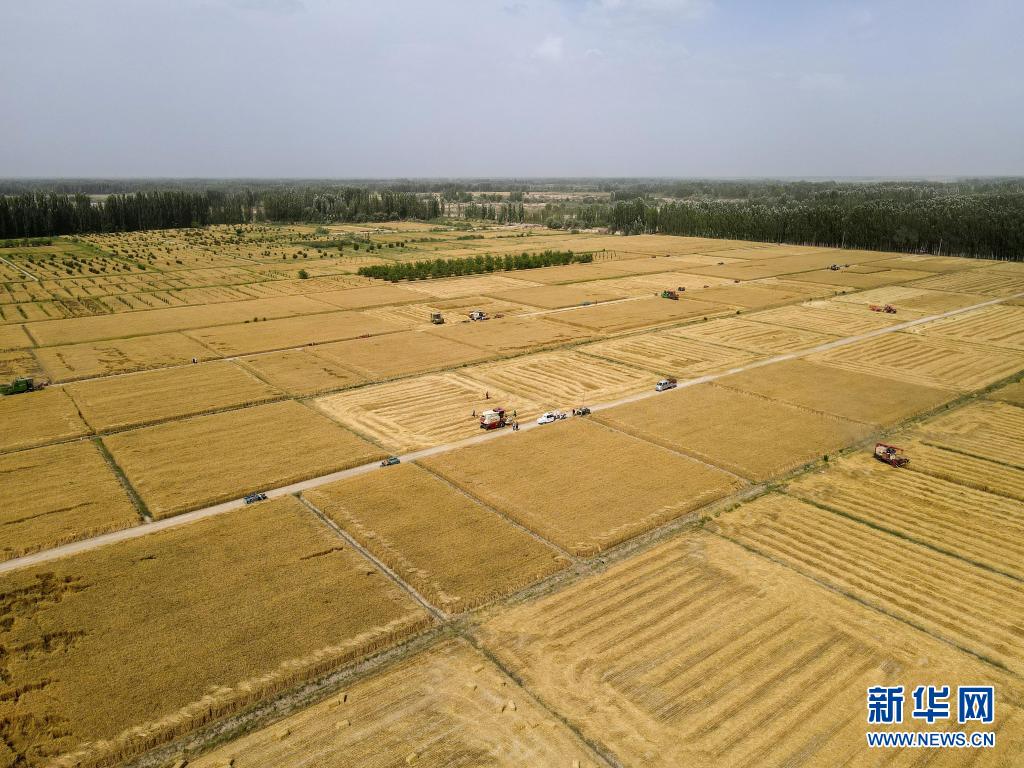 6月19日,空中俯瞰麥客阿地力·沙拉木工作的新疆庫車市齊滿鎮(zhèn)的麥?zhǔn)宅F(xiàn)場(chǎng)(無人機(jī)照片)。新華社記者 高晗 攝