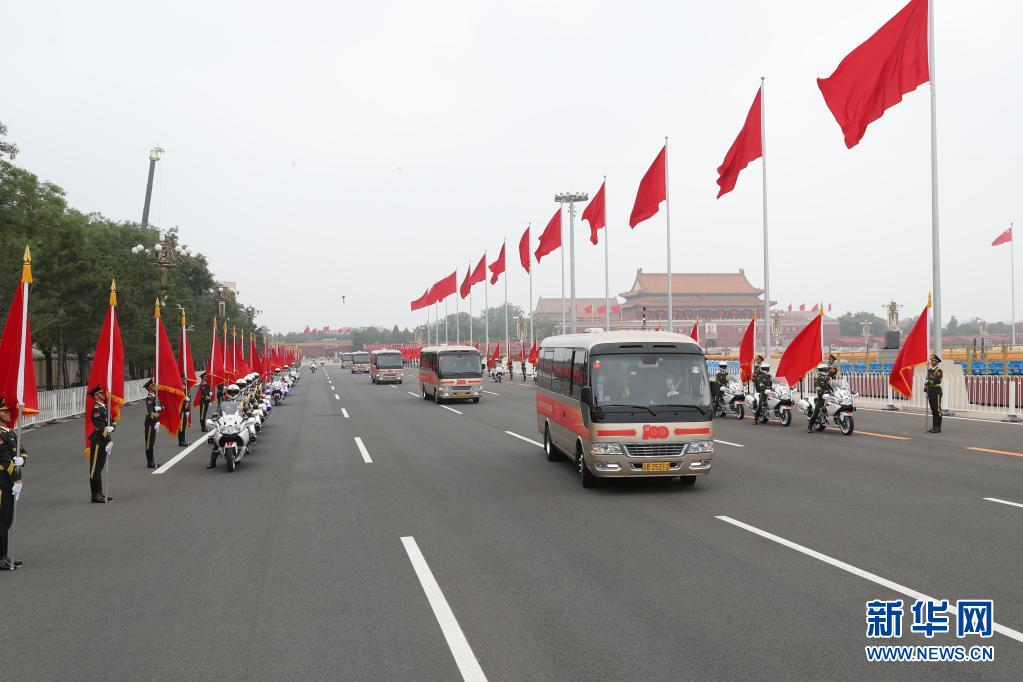 6月29日,慶祝中國共產(chǎn)黨成立100周年“七一勛章”頒授儀式在北京人民大會堂金色大廳隆重舉行。這是“七一勛章”獲得者集體乘坐禮賓車,由國賓護(hù)衛(wèi)隊(duì)護(hù)衛(wèi)前往人民大會堂。新華社記者 丁海濤 攝