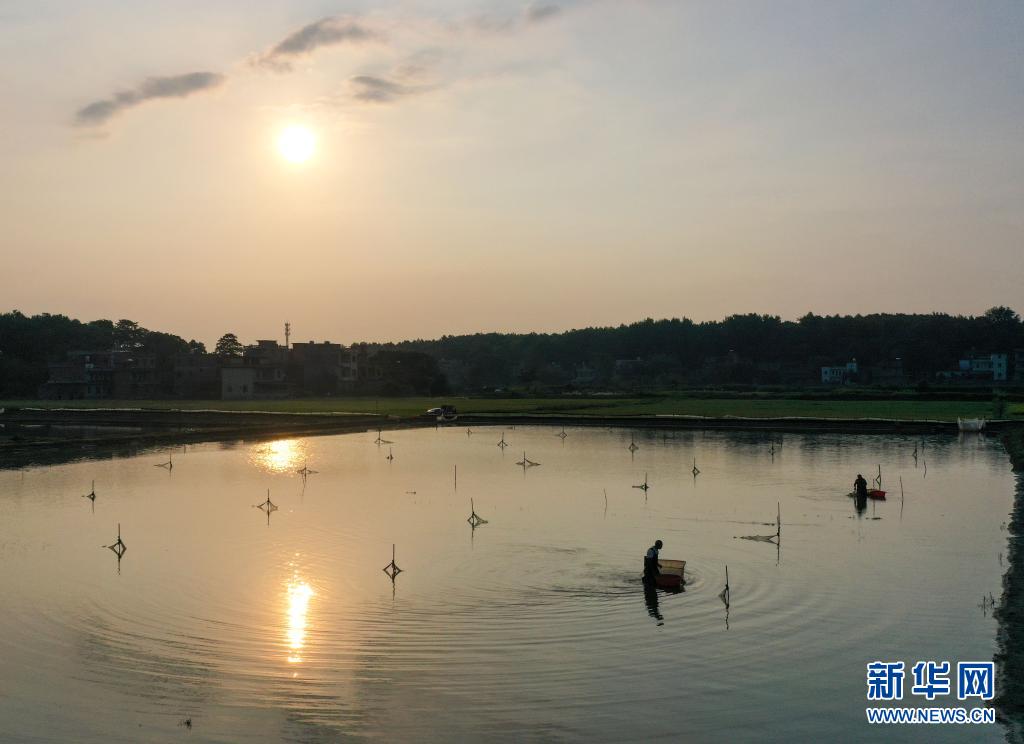 7月5日,在湖南省永州市道縣蚣?jí)捂?zhèn)洲背村,村民在收獲小龍蝦(無人機(jī)照片)。