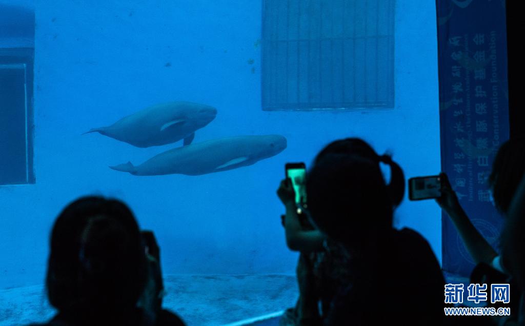 7月5日,小朋友在中國科學(xué)院水生生物研究所白鱀豚館舉行的“愛豚月”系列科普活動上觀看這對長江江豚母子。新華社記者肖藝九攝