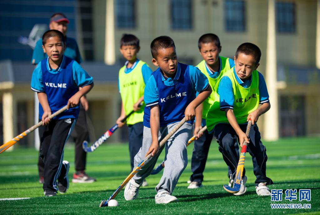 塔城市第二小學(xué)曲棍球隊的小隊員們在訓(xùn)練賽上拼搶(6月13日攝)。