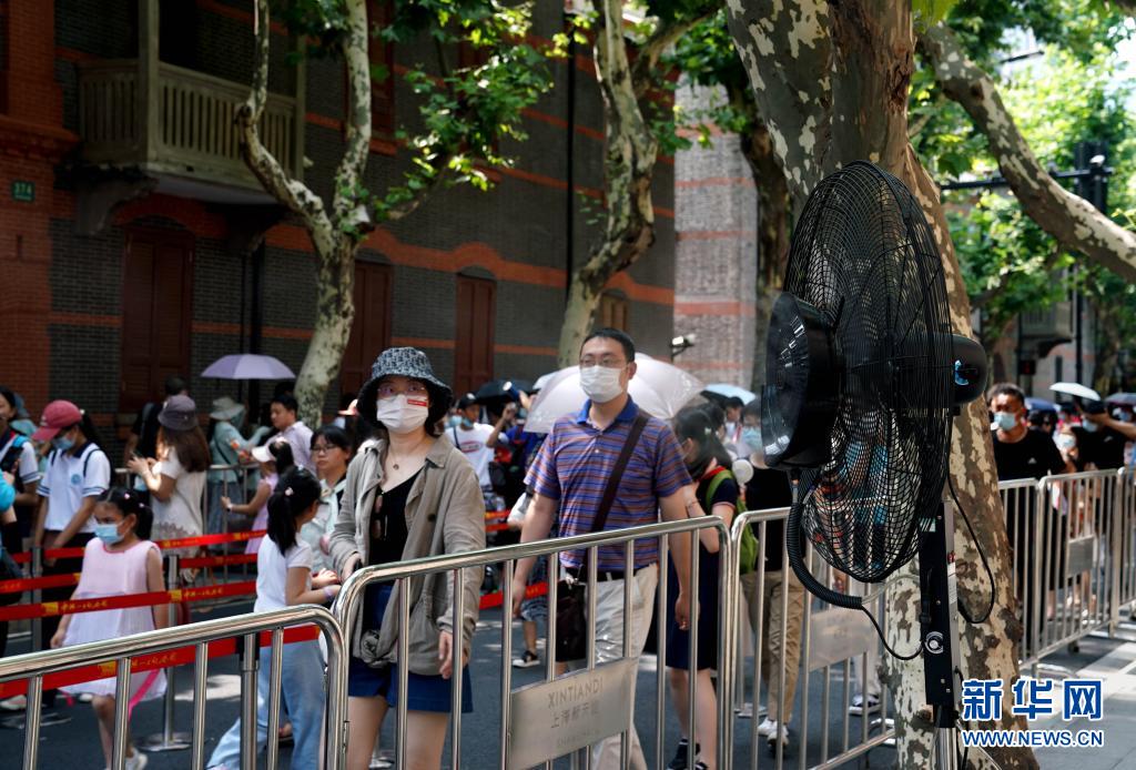 中共一大紀念館在觀眾排隊通道設(shè)置多個噴霧風扇用于降溫(7月11日攝)。