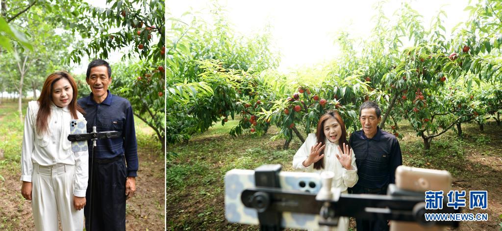 拼版照片:左圖為常阿娟和父親常乃民在山西省長治市潞州區(qū)東旺村果園里;右圖為常阿娟和父親常乃民通過網(wǎng)絡(luò)直播介紹自家種的水果(7月7日攝)。今年28歲的常阿娟原來在一家會計師事務(wù)所工作,2019年返鄉(xiāng)和父母一起打理果園。近兩年,常阿娟抓住網(wǎng)絡(luò)直播的熱潮,把鏡頭聚焦田間地頭,澆水、施肥、剪枝現(xiàn)場都成了她的“直播間”。借助網(wǎng)絡(luò)的力量,常阿娟家的產(chǎn)品不愁銷路,找她代售農(nóng)產(chǎn)品的村民也越來越多。