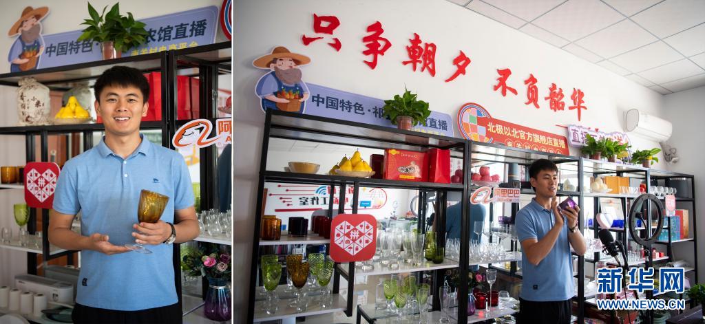 拼版照片:左圖為胡翔宇展示山西省祁縣產(chǎn)的玻璃杯;右圖為胡翔宇通過網(wǎng)絡直播介紹玻璃杯(7月6日攝)。今年31歲的胡翔宇是祁縣南關村人,在從事農(nóng)村電商之前,他做過工程設計、當過教師。2019年,胡翔宇回到家鄉(xiāng),開始從事祁縣特產(chǎn)和特色農(nóng)產(chǎn)品的銷售。2021年,南關村成立了電商平臺,為返鄉(xiāng)青年提供創(chuàng)業(yè)服務和便利條件,胡翔宇和他的團隊第一時間入駐。為拓寬銷售渠道,他開始嘗試直播帶貨,1個多月的時間,粉絲量已經(jīng)突破3000余人。