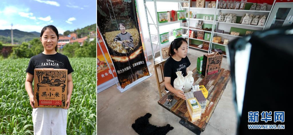拼版照片:左圖為王亞妮在山西省平順縣南坡村展示包裝好的小米;右圖為王亞妮通過網(wǎng)絡(luò)直播介紹合作社的小米、玉米糝、豆類等農(nóng)產(chǎn)品(7月9日攝)。今年26歲的王亞妮曾是一所學(xué)校的輔導(dǎo)員,2019年回到家鄉(xiāng)創(chuàng)業(yè)。身為農(nóng)民的孩子,王亞妮懂得父輩的辛苦和無奈,勞作一年到收獲季節(jié),農(nóng)產(chǎn)品卻賣不上好價(jià)錢。她一直想改變這種現(xiàn)狀,互聯(lián)網(wǎng)讓她看到了希望。通過電商銷售,合作社的農(nóng)產(chǎn)品銷往了全國(guó)各地。