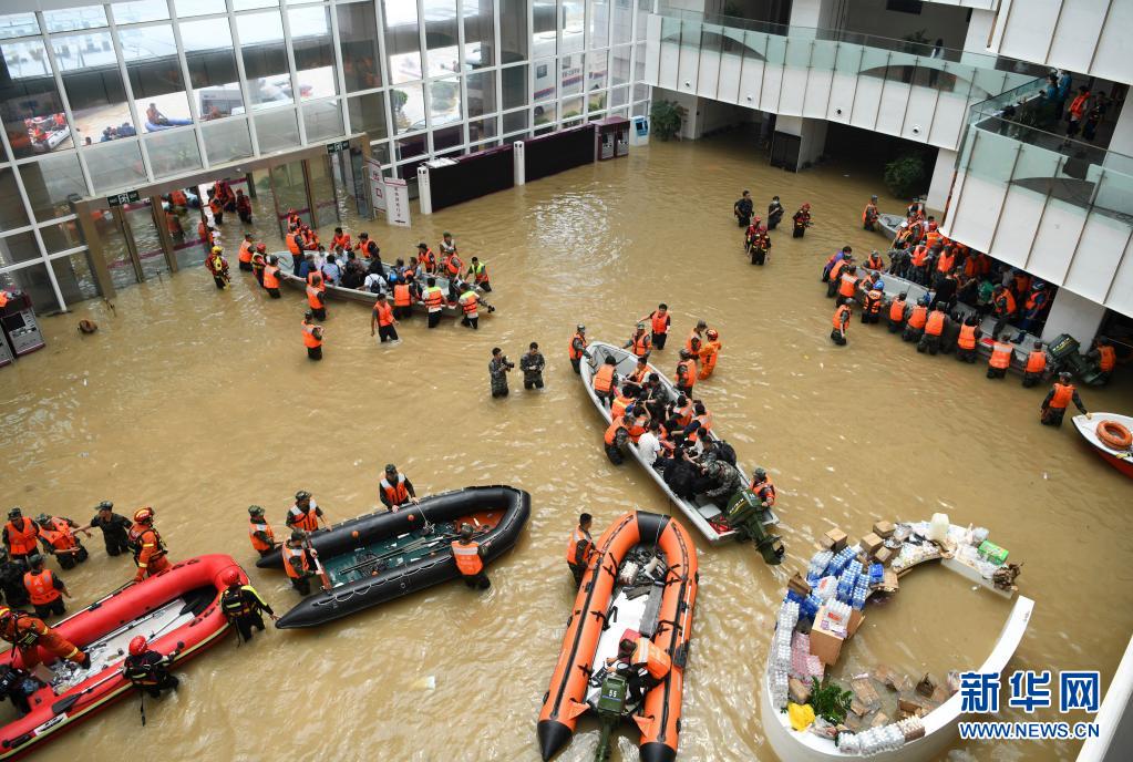 7月22日,在阜外華中心血管病醫(yī)院門診部,救援人員在積水的大廳內駕駛舟艇轉移病患。