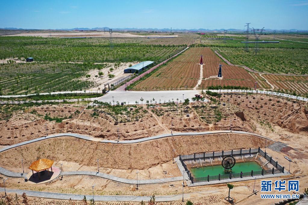 這是旱塬上的寧夏同心縣圣峰休閑生態(tài)觀光園(6月22日攝,無(wú)人機(jī)照片)。新華社記者 楊植森 攝