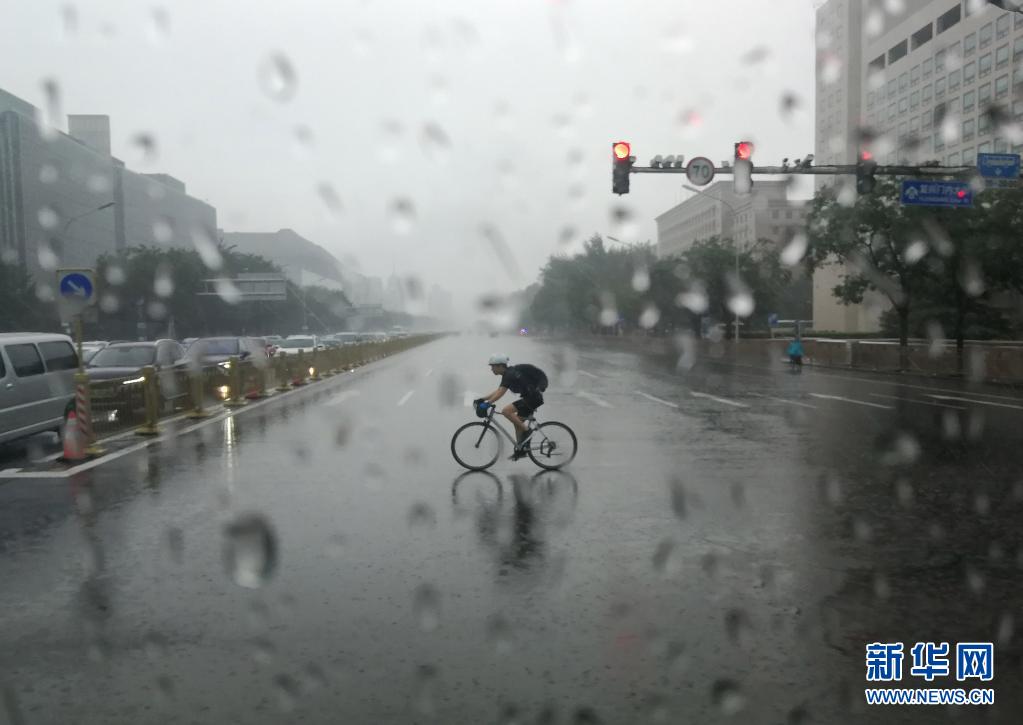 7月27日,騎行者冒雨經(jīng)過北京西單路口(手機拍攝)。