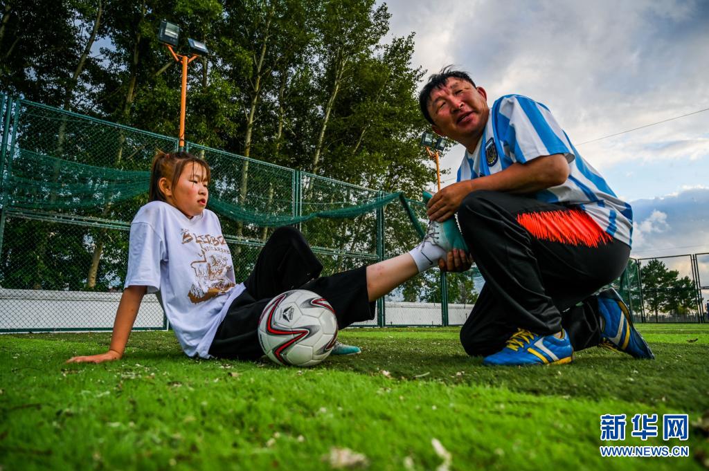 7月26日,在錫尼河西蘇木一處足球場(chǎng),父親嘎拉巴特爾(右)給吉布斯樂(lè)瑪做腿部拉伸。
