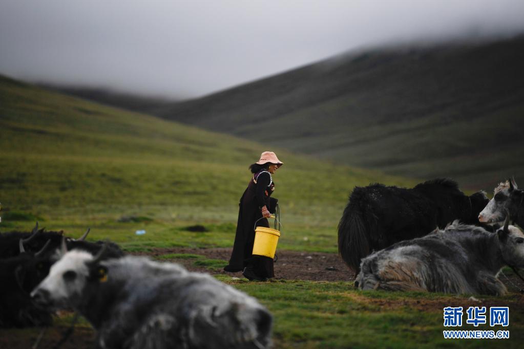 8月3日,在瑪沁縣當(dāng)洛鄉(xiāng)貢龍村的夏季草場(chǎng)上,牧民準(zhǔn)備擠牛奶。