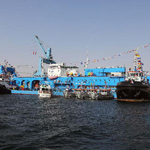 當(dāng)日,埃及蘇伊士運(yùn)河管理局在伊斯梅利亞舉行儀式,迎接最新購(gòu)入的“侯賽因·坦塔維”號(hào)大型絞吸式挖泥船。