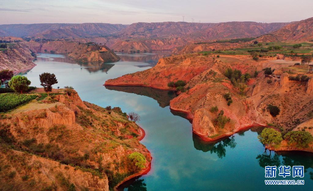 8月6日,朝霞映照下的靖邊縣龍洲鎮(zhèn)波浪谷丹霞景區(qū)(無人機照片)。