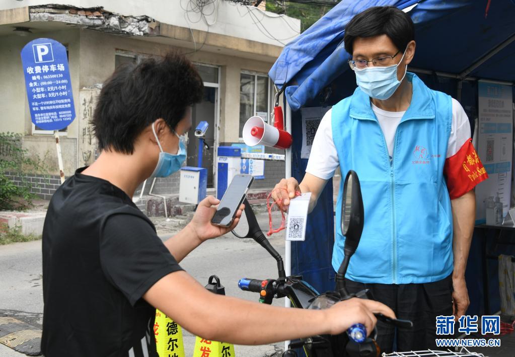 8月14日,在北京市海淀區(qū)薊門里社區(qū)出入口,馮向東(右)指導(dǎo)進(jìn)入社區(qū)的人員掃描健康寶。