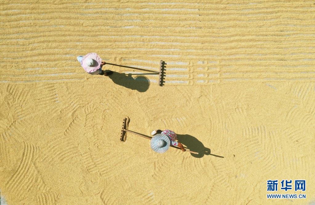 8月18日,赤水市復興鎮(zhèn)太和村的村民在晾曬稻谷(無人機照片)。