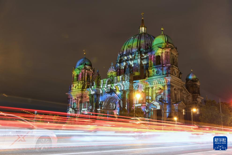 10月9日,德国柏林大教堂被灯光点亮(长时间曝光)。