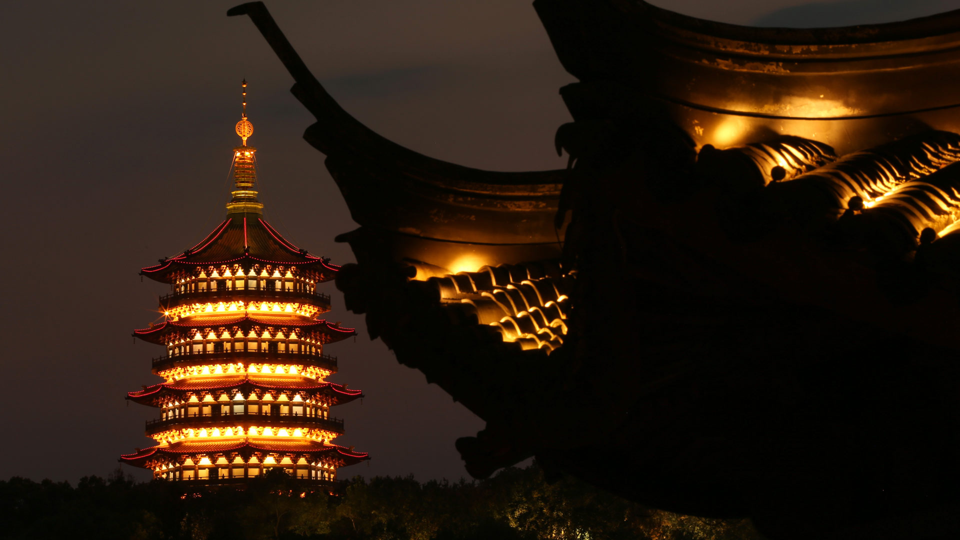 杭州雷峰塔夜景(左,8月31日攝)。 新華社記者殷剛攝