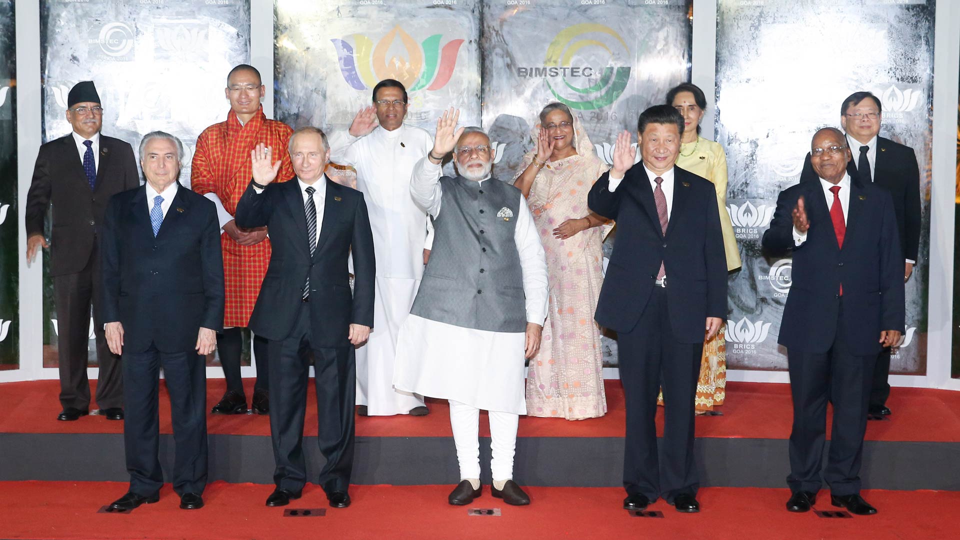 10月16日,金磚國(guó)家領(lǐng)導(dǎo)人同“環(huán)孟加拉灣多領(lǐng)域經(jīng)濟(jì)技術(shù)合作倡議”成員國(guó)領(lǐng)導(dǎo)人對(duì)話會(huì)在印度果阿舉行。國(guó)家主席習(xí)近平同印度總理莫迪、南非總統(tǒng)祖馬、巴西總統(tǒng)特梅爾、俄羅斯總統(tǒng)普京以及斯里蘭卡總統(tǒng)西里塞納、孟加拉國(guó)總理哈西娜、不丹首相托杰、尼泊爾總理普拉昌達(dá)、緬甸國(guó)務(wù)資政昂山素季、泰國(guó)政府代表等共同出席。這是與會(huì)領(lǐng)導(dǎo)人合影。新華社記者 姚大偉 攝