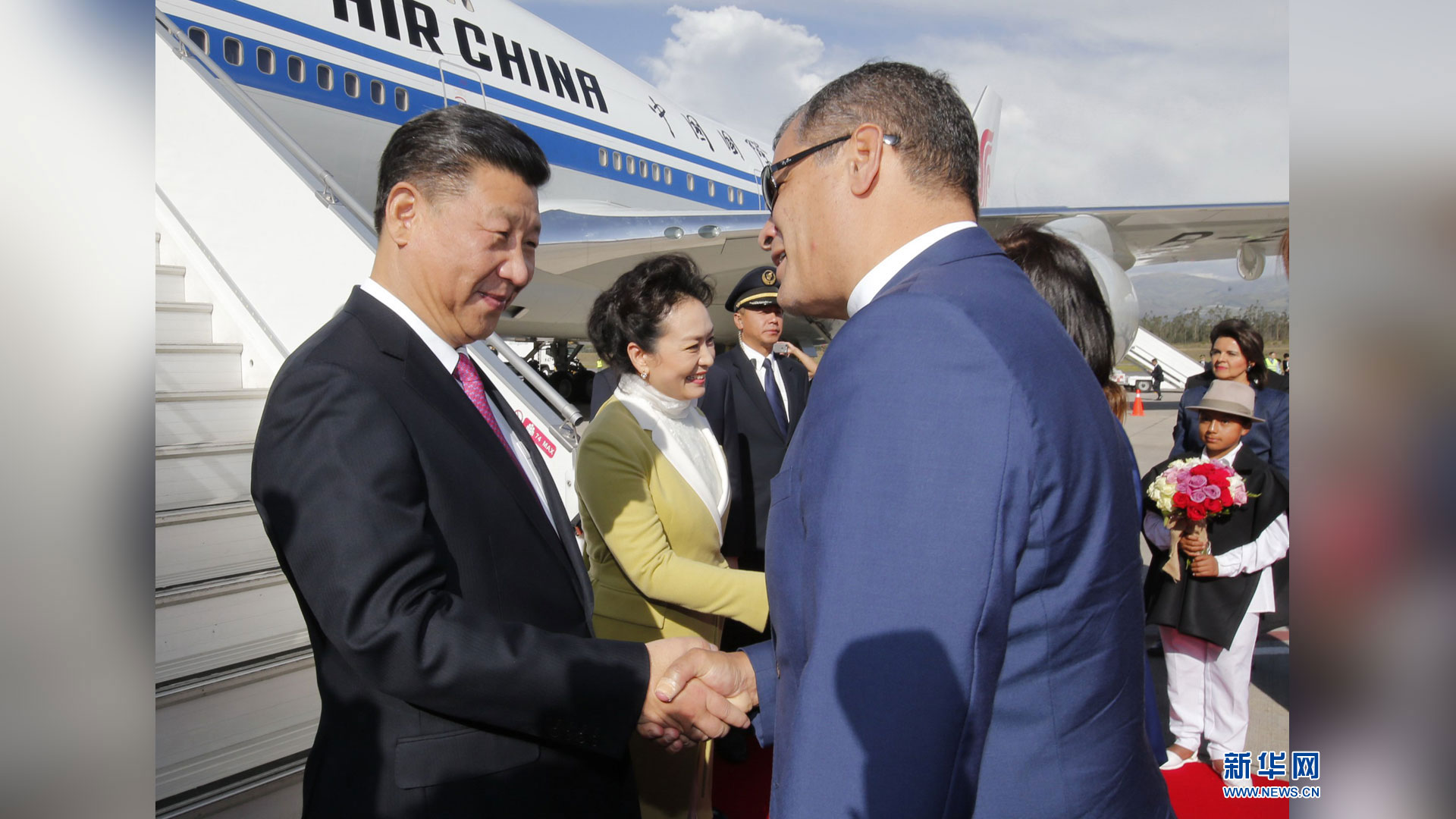 當?shù)貢r間11月17日,國家主席習近平乘專機抵達基多,開始對厄瓜多爾共和國進行國事訪問。厄瓜多爾總統(tǒng)科雷亞和夫人馬勒布等在機場熱情迎接習近平和夫人彭麗媛。新華社記者 鞠鵬 攝2016-11-18