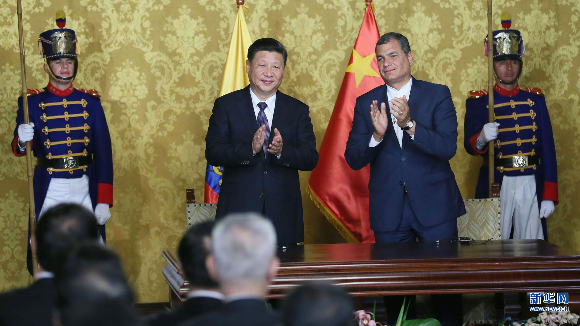 當?shù)貢r間11月17日,國家主席習近平在基多同厄瓜多爾總統(tǒng)科雷亞舉行會談。這是會談后,兩國元首見證雙邊合作文件的簽署。 新華社記者 鞠鵬攝2016-11-18