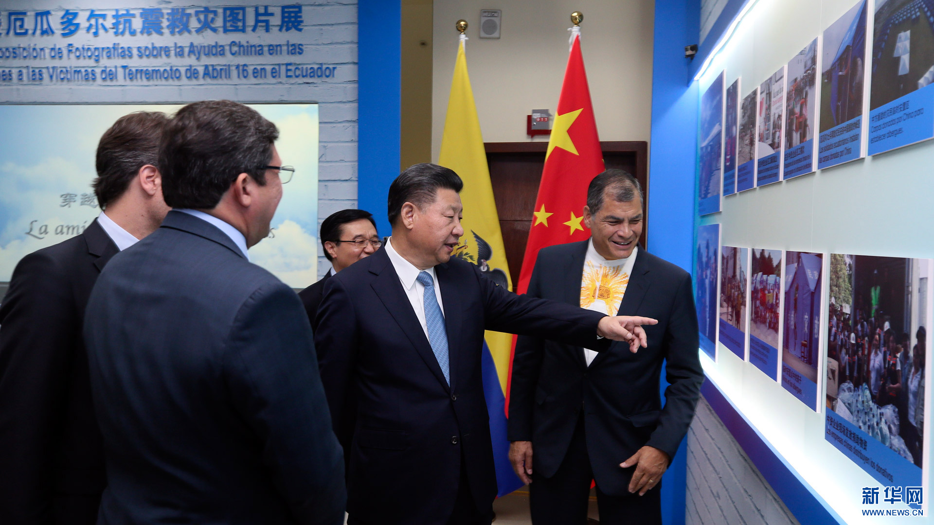 當?shù)貢r間11月18日,國家主席習近平在基多同厄瓜多爾總統(tǒng)科雷亞共同出席中方援建的厄瓜多爾公共安全應(yīng)急指揮中心聯(lián)合實驗室揭牌儀式,喬內(nèi)醫(yī)院奠基、科卡科多-辛克雷水電站竣工發(fā)電視頻連線活動。這是兩國元首共同參觀中方支援厄瓜多爾抗震救災(zāi)圖片展。新華社記者 蘭紅光 攝2016-11-19