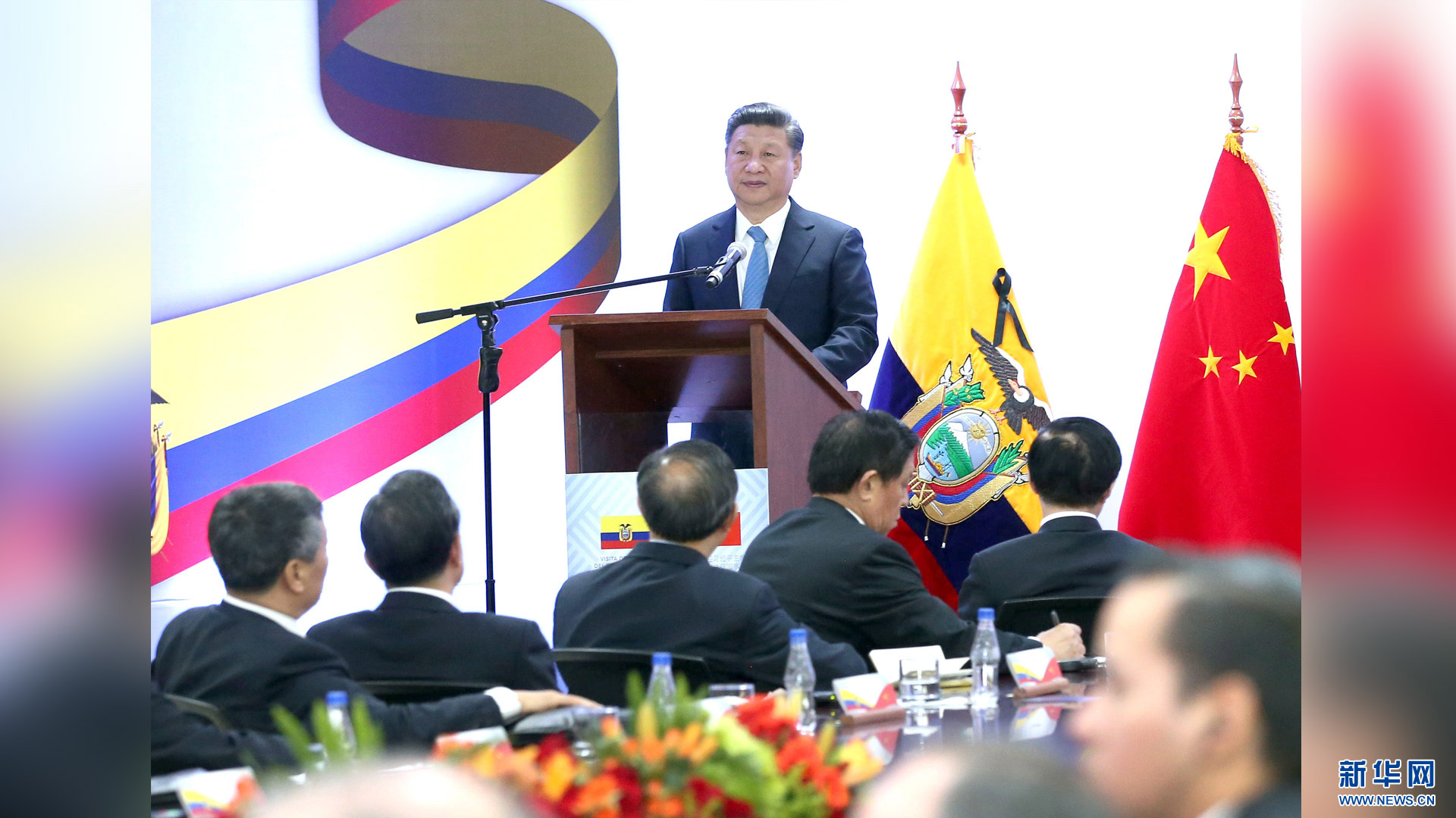 當?shù)貢r間11月18日,國家主席習近平在基多同厄瓜多爾總統(tǒng)科雷亞共同出席中方援建的厄瓜多爾公共安全應(yīng)急指揮中心聯(lián)合實驗室揭牌儀式,喬內(nèi)醫(yī)院奠基、科卡科多-辛克雷水電站竣工發(fā)電視頻連線活動。這是習近平出席活動后致辭。新華社記者 馬占成 攝2016-11-19