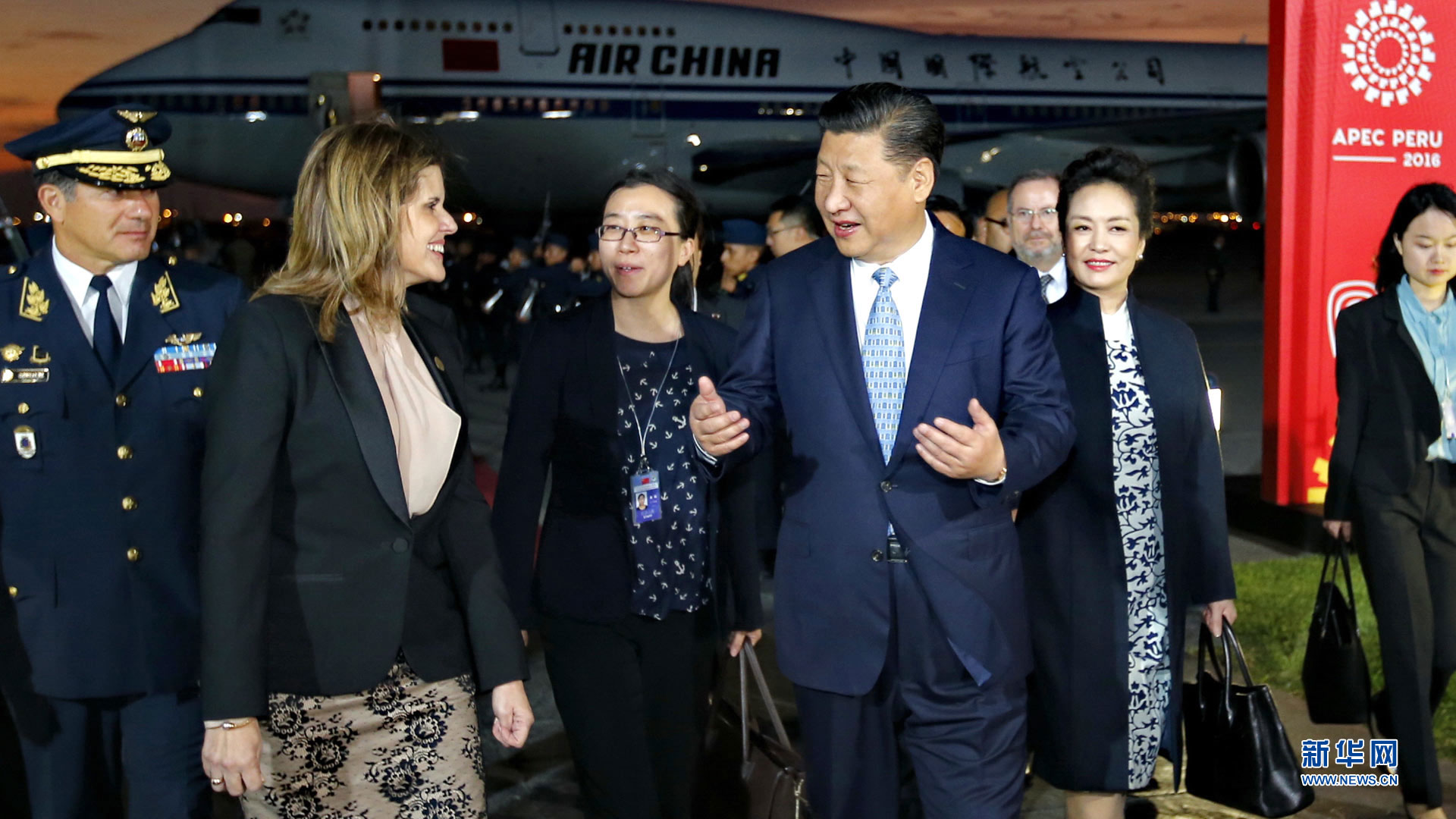 當?shù)貢r間11月18日,國家主席習近平抵達利馬,出席亞太經(jīng)合組織第二十四次領(lǐng)導人非正式會議并對秘魯共和國進行國事訪問。習近平和夫人彭麗媛受到秘魯副總統(tǒng)阿勞斯等熱情迎接。新華社記者 丁林 攝2016-11-20
