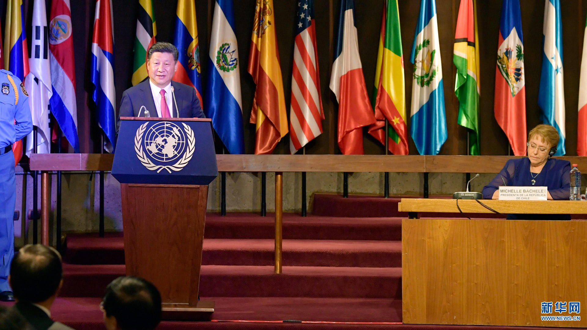 11月22日,國家主席習近平在圣地亞哥聯(lián)合國拉丁美洲和加勒比經(jīng)濟委員會總部出席中拉媒體領(lǐng)袖峰會開幕式。智利總統(tǒng)巴切萊特陪同出席。在熱烈的掌聲中,習近平發(fā)表題為《開創(chuàng)中拉媒體合作新局面》的致辭。新華社記者 鞠鵬 攝2016-11-23