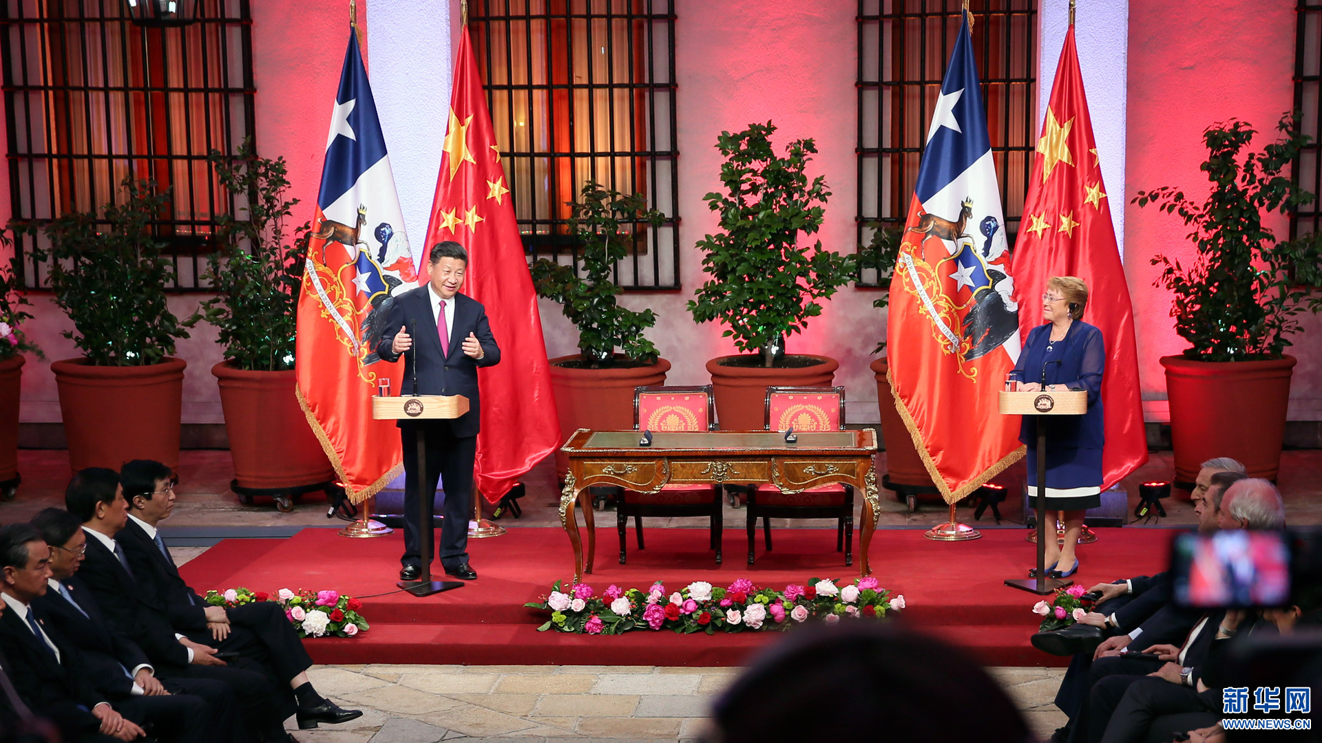 11月22日,國家主席習近平在圣地亞哥同智利總統(tǒng)巴切萊特舉行會談。這是會談后,兩國元首共同會見記者。 新華社記者 蘭紅光 攝2016-11-23
