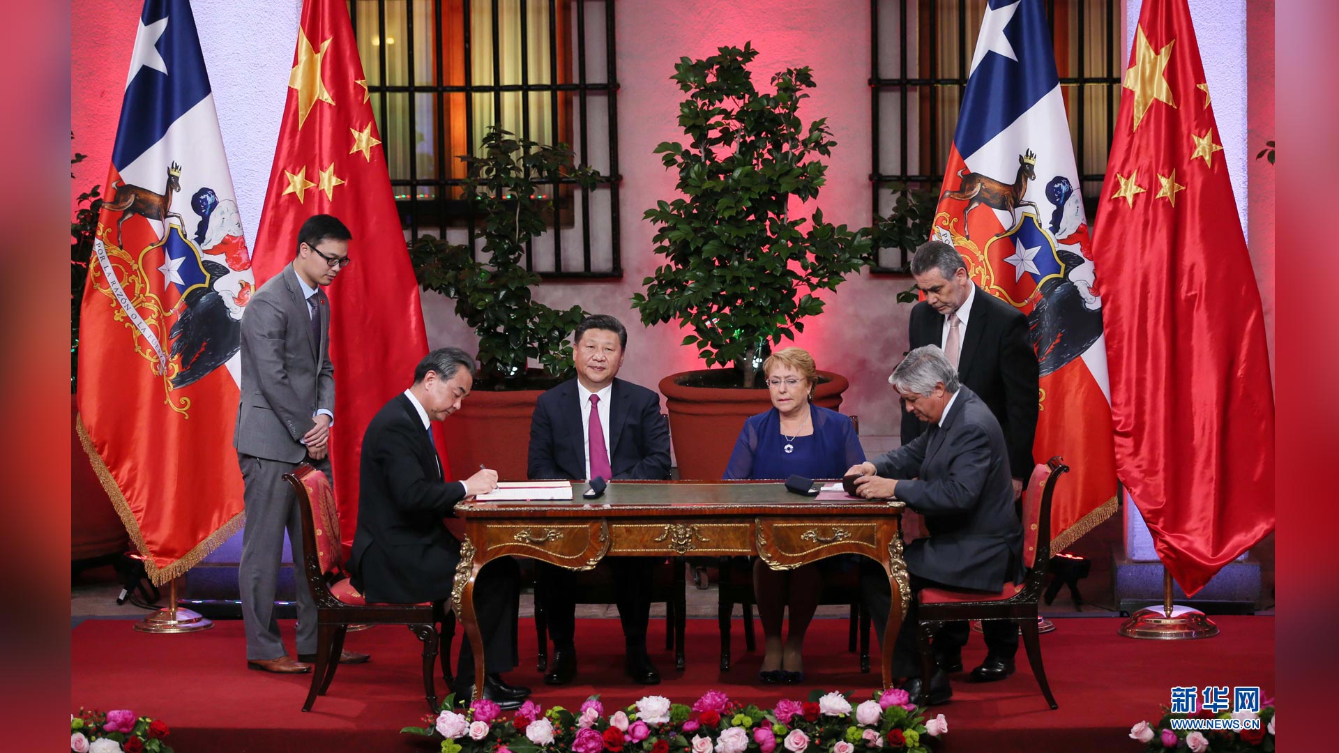 11月22日,國家主席習近平在圣地亞哥同智利總統(tǒng)巴切萊特舉行會談。這是會談后,兩國元首見證經(jīng)貿(mào)、農(nóng)業(yè)、質(zhì)檢、文化、教育、電子商務(wù)、信息通信、金融等領(lǐng)域多項雙邊合作文件的簽署。新華社記者 蘭紅光 攝2016-11-23