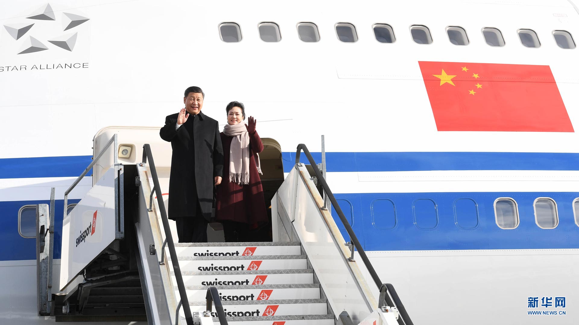 1月15日,國家主席習(xí)近平乘專機(jī)抵達(dá)蘇黎世,開始對(duì)瑞士聯(lián)邦進(jìn)行國事訪問。 這是習(xí)近平和夫人彭麗媛步出艙門。新華社記者饒愛民攝2017-01-16
