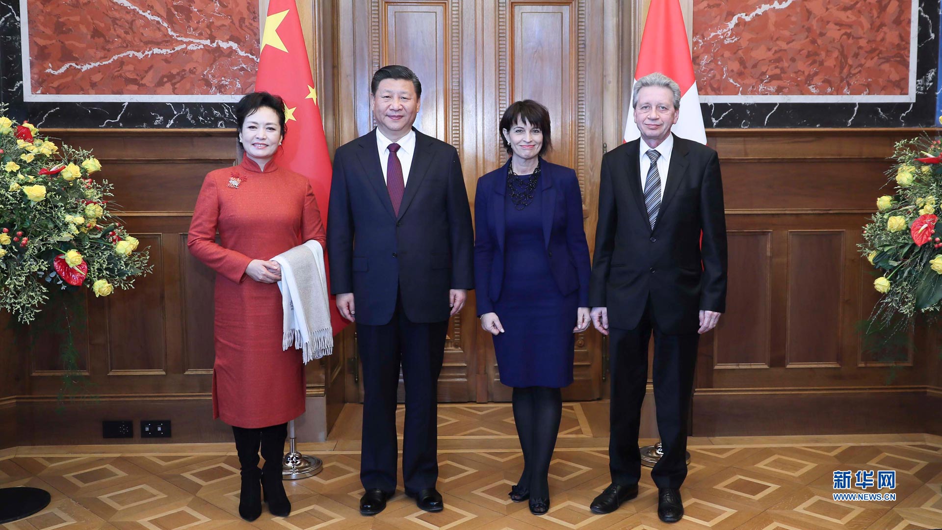 1月15日,國家主席習(xí)近平在伯爾尼出席瑞士聯(lián)邦委員會(huì)全體委員集體舉行的迎接儀式并致辭。這是瑞士聯(lián)邦主席洛伊特哈德夫婦在聯(lián)邦大廈迎接習(xí)近平和夫人彭麗媛。 新華社記者蘭紅光攝2017-01-16